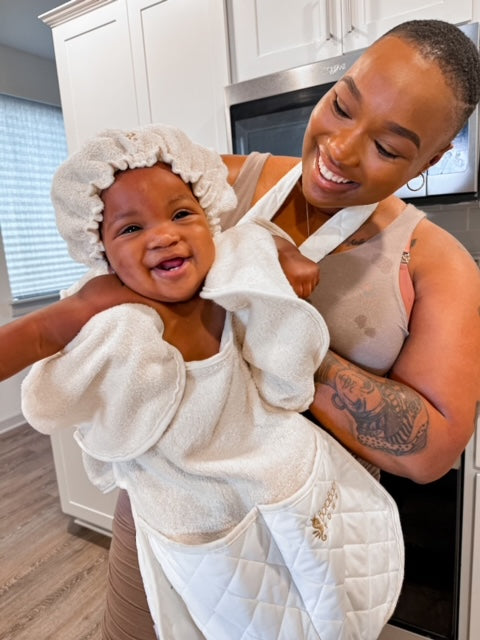 “Bora” means “the best” in Swahili, so our towel literally means “The Best Baby Towel.” To be worn by moms and dads, our towel keeps you dry and gives you extra use of your hands during the bathing process. It also holds essential bath items. Watch the video to see how it works!